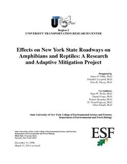 <p>This report explains the impacts of transportation infrastructure on herpetile populations, the landscape, local habitat, and architectural attributes of effective herpetile crossing structures and employs habitat analyses to identify 'connectivity zones' where crossing structures would be most appropriately deployed along New York State roadways. To conserve New Yorks herpetiles we must protect a diversity of habitats that they require as well as the connections between them. Roadways are a critical consideration because they frequently divide migration and dispersal routes of herpetiles. Virtually all species of frogs, toads, and salamanders move each year from forests and fields, where they spend much of the year feeding, resting, and hibernating, to wetlands to breed. Snakes also roam widely in search of prey and mates, visiting both wetlands and uplands in their meanderings. This study can provide science-based guidance for mitigating the effects of road-mortality on herpetofauna, both in New York State and elsewhere in the northeastern United States. It is clear from studies that roads have the capacity to influence both local and regional population dynamics of amphibians and reptiles. The degree to which road mortality affects populations seems highly dependent on the life-history characteristics of species and the degree to which natural habitat has been altered (both by roads and in other ways), however. Road mortality is of particular concern to populations of species such as turtles (i.e., species with high adult survival under natural conditions, late sexual maturity, and relatively low fecundity compared to other species of herpetofauna). To address these objectives seven integrated studies were conducted in support of these objectives Studies focusing on the design of crossing structures have tended to be based either on animals translocated to experimental arenas or monitoring the use of existing structures. The behavior of animals in the former approach may not represent that of animals under natural conditions. To test the effects of culvert attributes including length, diameter and substrate on choice, we applied a novel technique whereby experimental arrays were placed in the path of migrating spotted salamanders, allowing choice to occur under natural movement conditions. A higher abundance of spotted salamanders were found where flowing water was present on the upslope of the road. More American toads were found on sections of road without a wetland on the downslope side and where there was a culvert nearby. Spotted salamanders showed no clear preference for culverts with different attributes. Our results show that predicting where amphibians will be concentrated within crossing hotspots is possible, allowing effective placement of mitigation, but that these patterns are likely to differ between species. We found that spotted salamanders undergoing their natural movements appear to be more tolerant of differences between culverts when compared with studies in experimental arenas, and that a variety of different culverts will work as crossing structures</p>