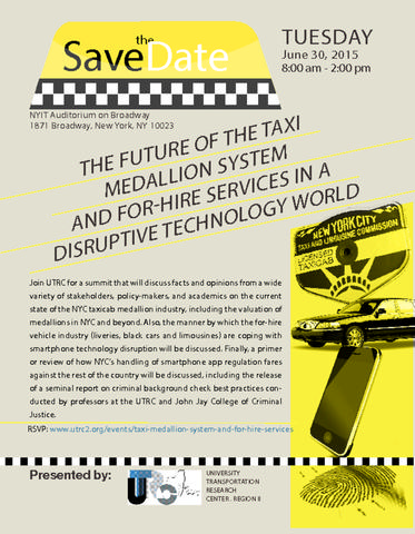UTRC hosted a half-day summit on June 23, 2015 at SUNY Global Center to discuss facts and opinions from a wide variety of stakeholders, policy-makers, and academics on the current state of the NYC taxicab medallion industry, including the valuation of medallions in NYC and beyond. Also, the manner by which the for-hire vehicle industry (liveries, black cars and limousines) are coping with smartphone technology disruption was discussed. Finally, a primer or review of how NYC's handling of smartphone app regulation fares against the rest of the country was discussed, including the release of a seminal report on criminal background check best practices conducted by professors at the UTRC and John Jay College of Criminal Justice. The Keynote Speaker was Hon. Michael Balboni, Former Deputy Secretary for Public Safety for New York State, Former New York State Senator and Chair of the New York State Senate Committee on Veterans, Homeland Secrurity and Military Affairs.