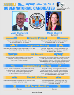 | Title: 2025 New Jersey Gubernatorial Candidates Transportation Voter Guide Author(s): Matthew W. Daus, Esq Publication Year: 2025 The 2025 New Jersey Gubernatorial Candidates Transportation Voter Guide was prepared by the University Transportation Research Center (UTRC). This guide is an objective comparison of the transportation policy positions of the two major… |