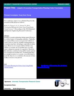 PROJECT DETAILS Author(s) Sung Hoon Chung Universities State University of New York (SUNY) Publication Year 2018 Publication Type Project Brief Project Adaptive Vehicle Routing for Evacuation under Uncertainty