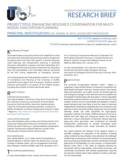 The University Transportation Research Center - Region 2, supported a study entitled “Barriers to Resource Coordination for Multi-Modal Evacuation Planning.” Extreme events that require large-scale evacuation are a great concern for disaster planners and emergency managers; most state and local municipalities are ill-prepared to handle large-scale evacuations. A lesson repeatedly learned from previous disasters (such as Hurricane Katrina) is that residents without access to automobiles and residents in need of special assistance are more likely to lack the means to evacuate independently. Developing integrated plans for jurisdictions and agencies to share resources (vehicles, equipment, communication networks, drivers and other personnel) for high-capacity evacuation methods and modes is diffi cult because of insurance, liability, and other legal and contractual matters. This research examines a unique combination of elements: disaster planning, large-scale urban evacuation, and coordination of volunteer transportation professionals to increase knowledge about coordinating eff ective multi- modal evacuation for disasters.