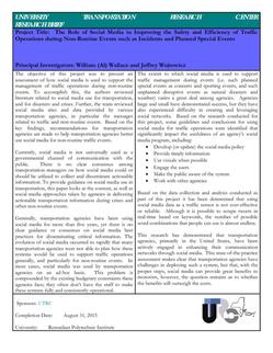 The objective of this project was to present an assessment of how social media is used to support the management of traffic operations during non-routine events. To accomplish this, the authors reviewed literature related to social media use for transportation, and for disasters and crises. Further, the team reviewed social media sites and data provided by various transportation agencies, in particular the messages related to traffic and non-routine events. Based on the key findings, recommendations for transportation agencies are made to help transportation agencies better use social media for non-routine traffic events.