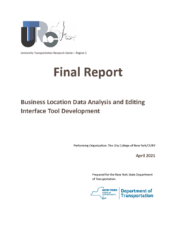 | Title: Business Location Data Analysis and Editing Interface Tool Development Author(s): Dr. Camille Kamga, Sandeep Mudigonda Publication Year: 2021 One of the most important aspects of transportation planning is understanding employment information of businesses and organizations. Information such as location of employment, size of organization or business in terms of employees, sales, can… |