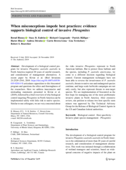 | Title: When misconceptions impede best practices: evidence supports biological control of invasive Phragmites Author(s): Bernd Blossey Publication Year: 2019 Development of a biological control program for invasive Phagmites australis australis in North America required 20 years of careful research, and consideration of management alternatives. A recent paper by Kiviat et al. (Biol Invasions 21:2529–… |