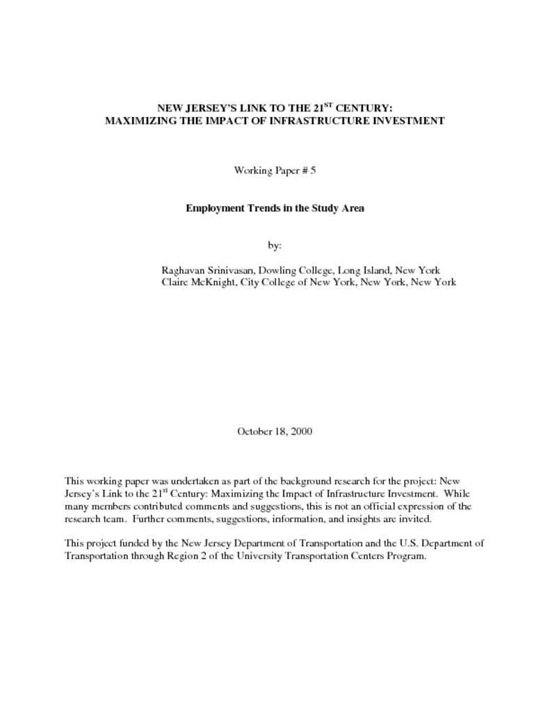 <p>The objective of this working paper is to show trends in employment in different industries in the study area. Two sets of tables and figures are presented to illustrate these trends. Tables 1A through 1D, and figures 1 through 10 show trends in non-farm employment for different labor areas from 1980 to 1999. Labor areas are also called Primary Metropolitan Statistical Areas (PMSA?s). In some cases, these labor areas consist of several counties. The study area consists of 14 counties that form 7 labor areas as indicated in the following table. Tables 2A through 2D and figures 11 through 26 show trends in private sector covered employment1 in the 14 county study area from 1991 to 1997. Data on non-farm employment in the different labor areas were obtained from the following web site maintained by the U.S. Department of Labor: www.bls.gov. Data on covered employment at the county level were obtained from the New Jersey Data Center: www.state.nj.us/labor/lra/njsdc.htm</p>