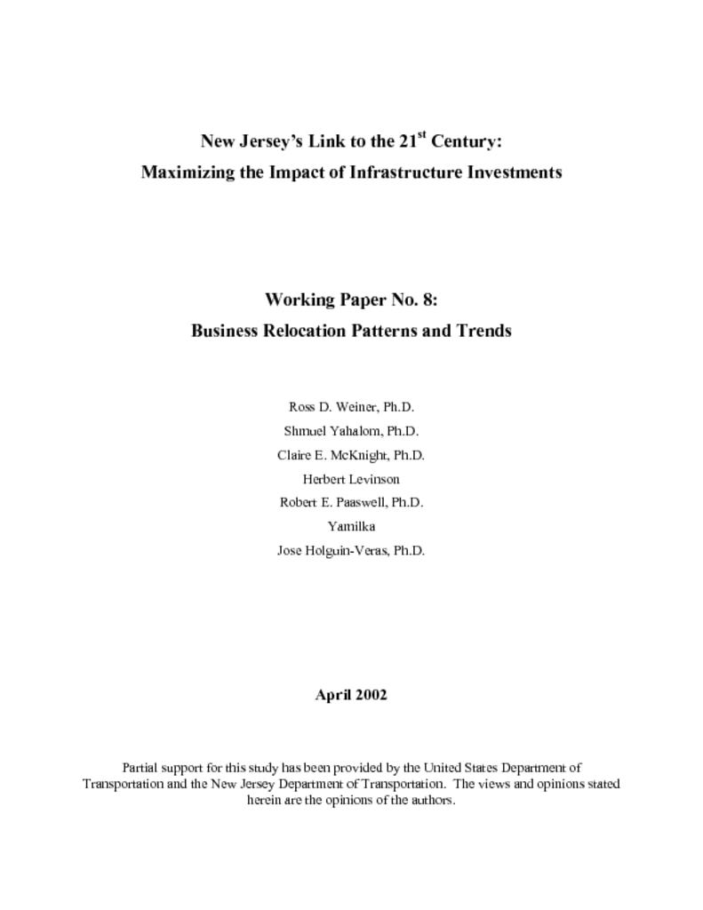 This working paper describes employment trends and patterns in New Jersey over the last decade. Its focus is on the relocation of firms and jobs, into New Jersey, and their transportation implications.
