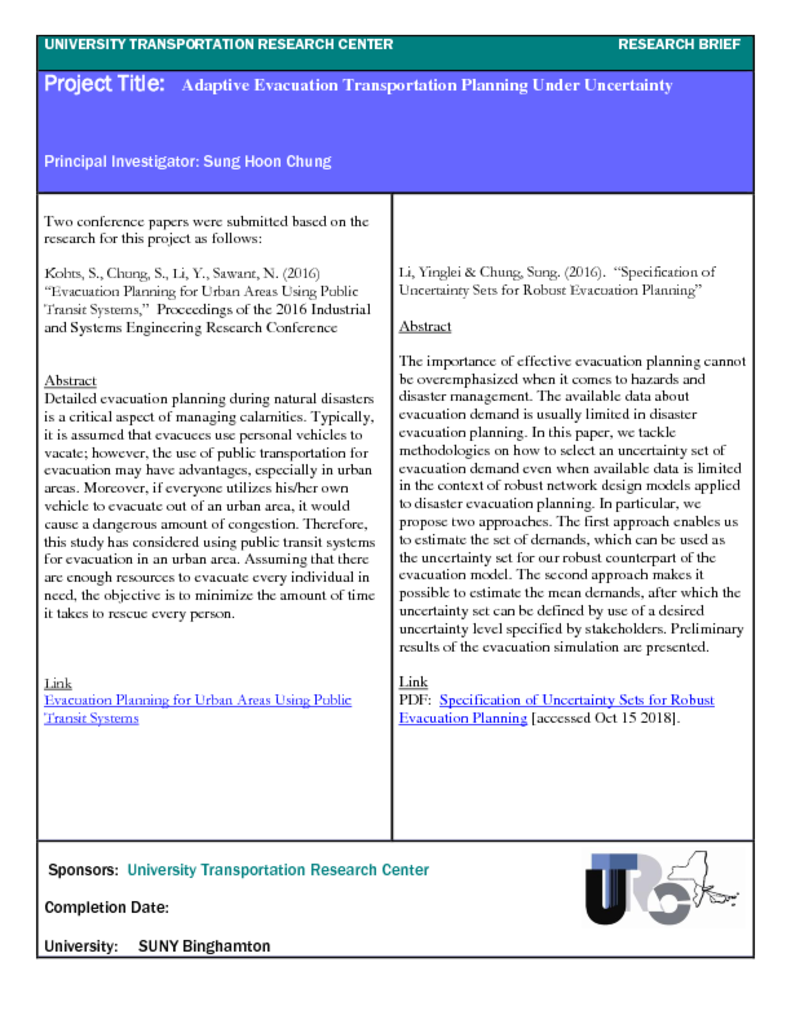 PROJECT DETAILS Author(s) Sung Hoon Chung Universities State University of New York (SUNY) Publication Year 2018 Publication Type Project Brief Project Adaptive Vehicle Routing for Evacuation under Uncertainty