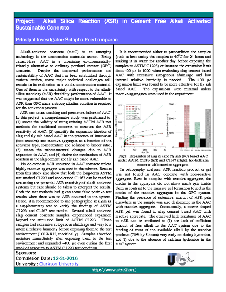 Alkali-activated concrete (AAC) is an emerging technology in the construction materials sector. Being cement-free, AAC is a promising environmentally-friendly alternative to ordinary portland cement (OPC) concrete. Despite the improved performance and sustainability of AAC that has been established through various studies, some major technical challenges still remain in its realization as a viable construction material. One of them is the uncertainty with respect to the alkali-silica reactivity (ASR) durability performance of AAC. It was suggested that the AAC might be more vulnerable to ASR than OPC since a strong alkaline solution is required for the activation process.