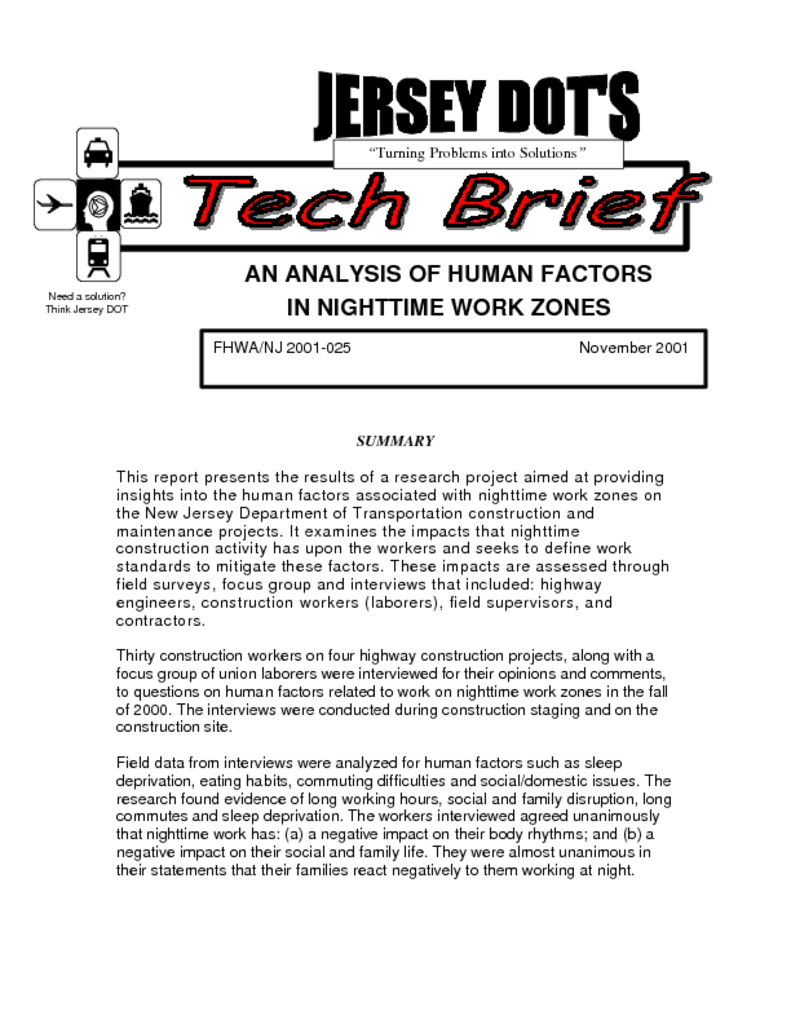 <p>This report presents the results of a research project aimed at providing insights into the human factors associated with nighttime work zones on the New Jersey Department of Transportation construction and maintenance projects. It examines the impacts that nighttime construction activity has upon the workers and seeks to define work standards to mitigate these factors. These impacts are assessed through field surveys, focus group and interviews that included: highway engineers, construction workers (laborers), field supervisors, and contractors.</p>