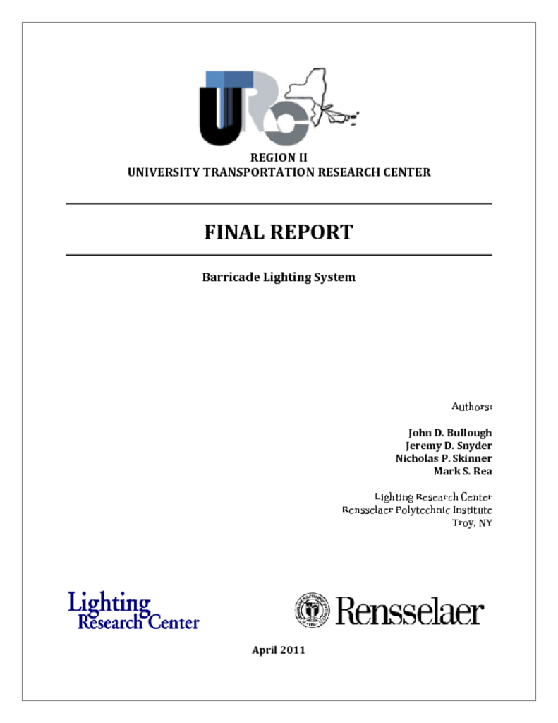 <p>Barricade warning lights have been used for many years at construction sites to indicate to drivers that caution is needed. A benefit of these warning lights is that they are widely recognized and understood, but a downside is that &quot;caution&quot; is the only message that they are able to communicate. Drivers may not know what action should be taken until additional information is available, or it is too late. Through the Region II University Transportation Research Center?s (UTRC?s) Research Initiative, the Lighting Research Center (LRC) at Rensselaer Polytechnic Institute proposes to develop a new barricade lighting system that will go beyond ???caution??? to provide important information about the construction site by utilizing a number of unique features available through LED lighting technologies. Different colors, spatial arrays, and temporal profiles can be used in conjunction with wireless controls and radar speed measurements to communicate important information visually about the construction site. The four signals used in the barricade lighting system, their anticipated effect on driver behavior in comparison with standard Type B amber barricade warning lights, the construction zone situation in which they???d be used, and the performance measurement are: 1. Signal: flashing green light. Anticipated driver behavior: proceed through at higher speed. Used when: work zone is unoccupied and drivers can proceed through at the normal speed limit. Performance measurement: speed and deceleration. 2. Signal: flashing red light. Anticipated driver behavior: reduce speed more sharply. Used when: there is stopped or extremely slow traffic immediately ahead, as indicated by radar. Performance measurement: deceleration, distance from obstacle at which car comes to a stop. 3. Signal: &quot;shifting&quot; yellow light (a circular light that fills from left to right or from right to left indicating direction of needed lane shift). Anticipated driver behavior: change lanes sooner. Used when: there is a lane closure. Performance measurement: distance ahead of lane closure that drivers shift lanes. 4. Signal: &quot;looming&quot; yellow light (a circular light filling outwardly from the center). Anticipated driver behavior: drive slower. Used when: work zone is staffed and great caution is needed. Performance measurement: speed and deceleration. To determine the effectiveness of this barricade light system, the flash patterns described above will be tested on a closed track. Test subjects will drive a car- instrumented to measure throttle variation, braking, speed, and position- through the track set up with barricades and other indicators to simulate the four situations described above. Measured performance will be compared between runs with the barricade lighting system and runs with standard barricade warning lights to determine if the barricade lighting system has the anticipated effect on driver behavior. The project team will include LRC researchers from the transportation and the solid-state lighting programs. A work product for the evaluation will include a technical report summarizing the assessment and providing guidelines on how this signaling system might be used. Video of the experimental sessions for the barricade lighting system evaluation conducted on November 2010.</p>