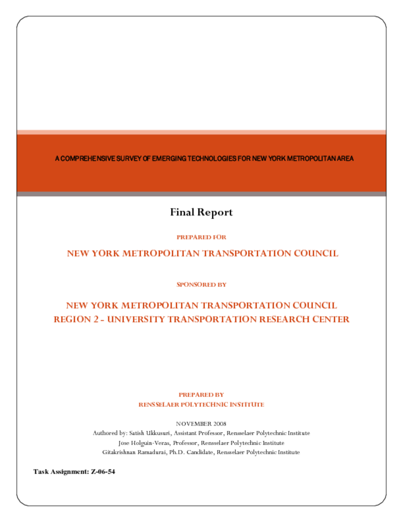 Professors Satish Ukkusuri and Jose Holguin-Veras of Rensselaer Polytechnic Institute (RPI), as a result of an RFP process through the UTRC, have been selected by a selection committee to conduct an assessment of the emerging and promising technology that is likely to impact transportation in the NYMTC region. The professors and their support staff at RPI shall provide the following: Task 1: Literature review (Technical Memorandum (TM ) #1) Task 2: Initial List of Emerging Technologies (TM #2) Task 3: Screening of Emerging Technologies Task 4: Short List of Likely Technologies (TM#3) Task 5: Assessment of Short Listed Technologies (TM #4) Task 6: Full Day Conference to release findings (TM #5) Final report (draft and final)