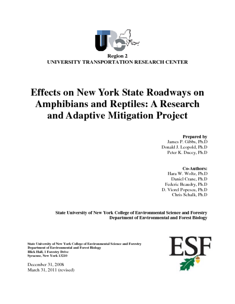 <p>This report explains the impacts of transportation infrastructure on herpetile populations, the landscape, local habitat, and architectural attributes of effective herpetile crossing structures and employs habitat analyses to identify 'connectivity zones' where crossing structures would be most appropriately deployed along New York State roadways. To conserve New Yorks herpetiles we must protect a diversity of habitats that they require as well as the connections between them. Roadways are a critical consideration because they frequently divide migration and dispersal routes of herpetiles. Virtually all species of frogs, toads, and salamanders move each year from forests and fields, where they spend much of the year feeding, resting, and hibernating, to wetlands to breed. Snakes also roam widely in search of prey and mates, visiting both wetlands and uplands in their meanderings. This study can provide science-based guidance for mitigating the effects of road-mortality on herpetofauna, both in New York State and elsewhere in the northeastern United States. It is clear from studies that roads have the capacity to influence both local and regional population dynamics of amphibians and reptiles. The degree to which road mortality affects populations seems highly dependent on the life-history characteristics of species and the degree to which natural habitat has been altered (both by roads and in other ways), however. Road mortality is of particular concern to populations of species such as turtles (i.e., species with high adult survival under natural conditions, late sexual maturity, and relatively low fecundity compared to other species of herpetofauna). To address these objectives seven integrated studies were conducted in support of these objectives Studies focusing on the design of crossing structures have tended to be based either on animals translocated to experimental arenas or monitoring the use of existing structures. The behavior of animals in the former approach may not represent that of animals under natural conditions. To test the effects of culvert attributes including length, diameter and substrate on choice, we applied a novel technique whereby experimental arrays were placed in the path of migrating spotted salamanders, allowing choice to occur under natural movement conditions. A higher abundance of spotted salamanders were found where flowing water was present on the upslope of the road. More American toads were found on sections of road without a wetland on the downslope side and where there was a culvert nearby. Spotted salamanders showed no clear preference for culverts with different attributes. Our results show that predicting where amphibians will be concentrated within crossing hotspots is possible, allowing effective placement of mitigation, but that these patterns are likely to differ between species. We found that spotted salamanders undergoing their natural movements appear to be more tolerant of differences between culverts when compared with studies in experimental arenas, and that a variety of different culverts will work as crossing structures</p>