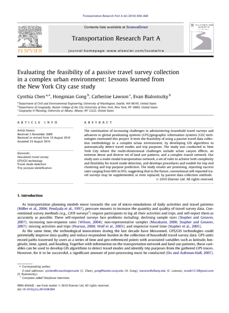 The combination of increasing challenges in administering household travel surveys and advances in global positioning systems (GPS)/geographic information systems (GIS) technologies motivated this project. It tests the feasibility of using a passive travel data collection methodology in a complex urban environment, by developing GIS algorithms to automatically detect travel modes and trip purposes. The study was conducted in New York City where the multi-dimensional challenges include urban canyon effects, an extreme dense and diverse set of land use patterns, and a complex transit network. Our study uses a multi-modal transportation network, a set of rules to achieve both complexity and flexibility for travel mode detection, and develops procedures and models for trip end clustering and trip purpose prediction. The study results are promising, reporting success rates ranging from 60% to 95%, suggesting that in the future, conventional self-reported travel surveys may be supplemented, or even replaced, by passive data collection methods