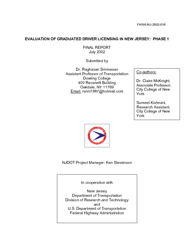 <p>New Jersey started enforcing a graduated driver license (GDL) system on January 1, 2001. The system requires a three-step process for full licensing: learner's permit at 16 years of age at the earliest; provisional license at 17; and, a basic license at 18. This report is the first phase of an evaluation of the New Jersey GDL system. The number and types of traffic crashes, traffic violations, and license suspensions in New Jersey by age for the years immediately before 2001 were analyzed. The second phase will look at the same type of data after 2001 and will compare the results to the pre 2001 analysis to determine what the impact of GDL has been. The analysis of the pre-2001 data shows that 17 year olds have substantially more crashes and violations per 10,000 people compared to other drivers. A higher percentage of their crashes are single vehicle crashes. In addition, a much higher percent of their crashes are due to unsafe speed, and a higher percent of their crashes are due to inattention, and a failure to obey traffic control devices or yield right of way, compared to middle aged drivers. A higher percent of their violations are due to speeding than any other age group, and a higher percent are due to careless driving than for middle-aged drivers, but not for older drivers.</p>