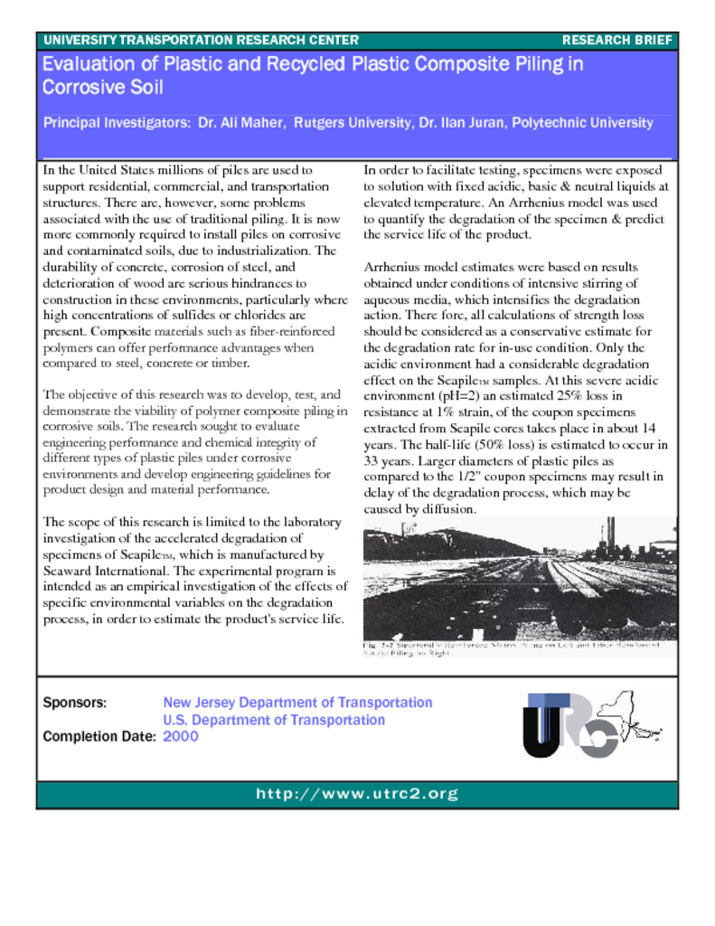 In the United States millions of piles are used to support residential, commercial, and transportation structures. There are, however, some problems associated with the use of traditional piling. It is now more commonly required to install piles on corrosive and contaminated soils, due to industrialization. The durability of concrete, corrosion of steel, and deterioration of wood are serious hindrances to