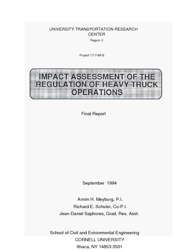 <p>The main objective of this project was to evaluate the impact of the New York State divisible-load permit system for heavy trucks in terms of benefits and costs to society. The costs result primarily from increased pavement damage; the benefits accrue to the trucking industry (primary economic benefits) and also to New York State's economy (secondary economic benefits). The present study is a follow-up of an earlier investigation (1 987, Meyburg, Richardson, Schuler, et al.) that was commissioned by the New York State Permanent Advisory Committee on Truck Weights to investigate benefits of the divisible-load permit system. Research objectives for this project have been expanded and modified, based on findings from the surveys. Seasonal benefits and costs for several levels of departure from the federal weight regime were evaluated in order to assess the "optimum" weight limit under a simplified weight system, based on ratios of the federal limits.</p>