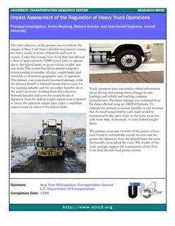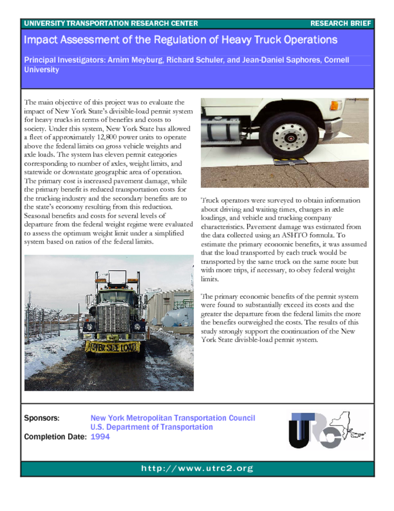 The main objective of this project was to evaluate the impact of New York State’s divisible-load permit system for heavy trucks in terms of benefits and costs to society. Under this system, New York State has allowed a fleet of approximately 12,800 power units to operate above the federal limits on gross vehicle weights and axle loads. The system has eleven permit categories corresponding to number of axles, weight limits, and statewide or downstate geographic area of operation. The primary cost is increased pavement damage, while the primary benefit is reduced transportation costs for the trucking industry and the secondary benefits are to the state’s economy resulting from this reduction. Seasonal benefits and costs for several levels of departure from the federal weight regime were evaluated to assess the optimum weight limit under a simplified system based on ratios of the federal limits.