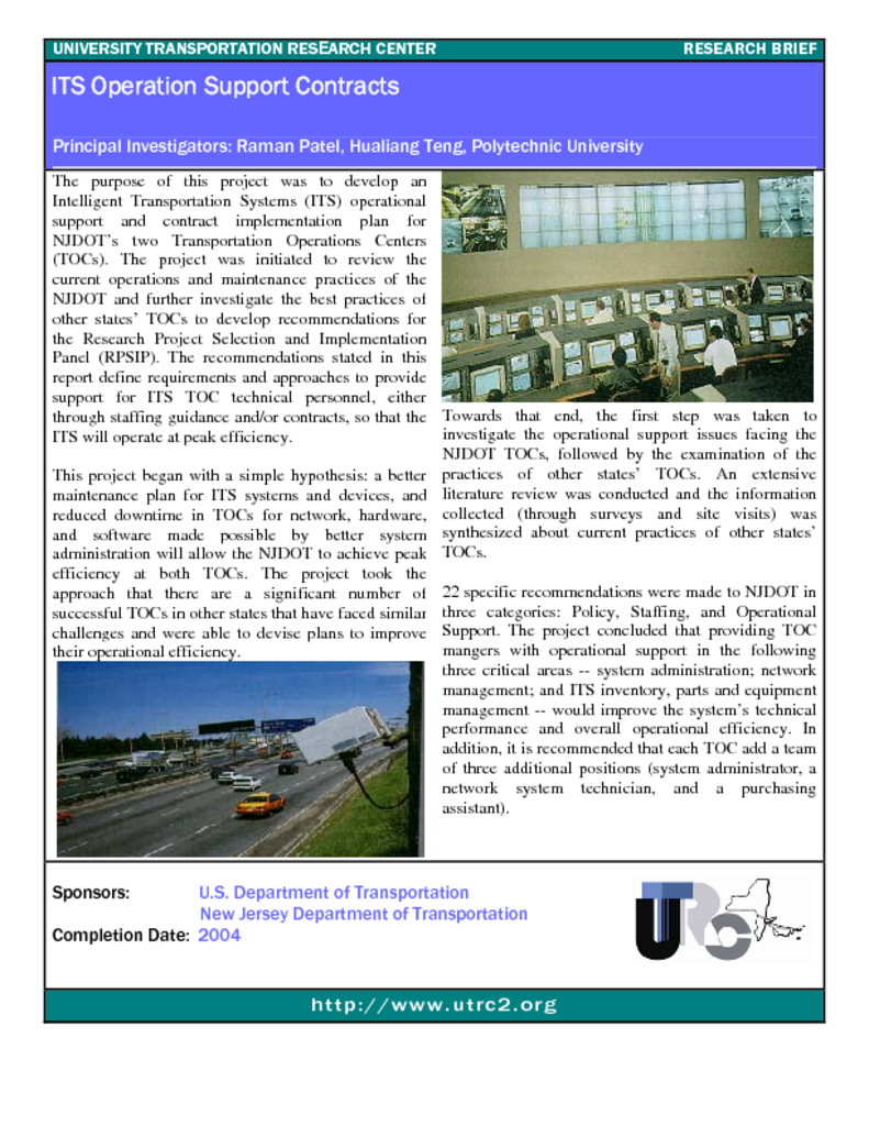 <p>The New Jersey Department of Transportation (NJDOT) is currently facing a significant challenge in keeping Intelligent Transportation Systems (ITS) at a high level of availability at the Transportation Operation Center North (TOC North) and Transportation Operation Center South (TOC South). As more and more components are added to the ITS infrastructure, system administration, system management and system operational support become very critical for TOCs. This project was initiated to review current issues facing NJDOT and investigate practices of the other states? TOCs, and report on the findings that may be helpful to the NJDOT in devising its operational support contracts for TOC North and TOC South. This report outlines the issues faced by the NJDOT in operating and maintaining ITS, and recommends an implementation plan for the maintenance and support requirements. The report makes recommendations on policy, staffing and operational support needs based on the survey results and visits of other states? TOCs, and literature review and examination of the current practices of TOCs in the country. The report provides Job specifications for the recommended positions. The NJDOT will consider these recommendations in developing next steps for the TOC operational support for TOC North and TOC South. 17.</p><p>&nbsp;</p>
