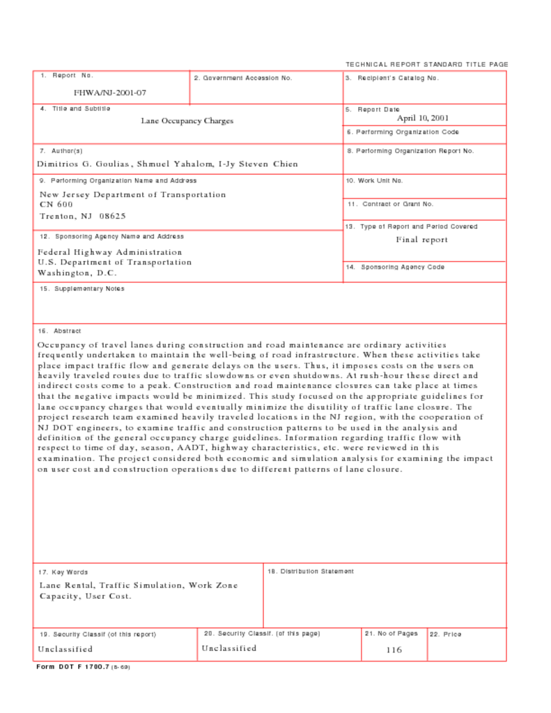 The objective of this study was to address the NJDOT need in developing appropriate guidelines for lane charges that would minimize the closure of traffic lanes. The developed guidelines considered the impact on traffic and road users, depending on the characteristics of the projects. The study provided the general lane closure guidelines that can be used on a specific project and with respect to the specific project characteristics related to the AADT during the time of day, season, and type of highway/lane closure. It is expected that the criteria used to determine lane rental value for maintenance and construction schedule alternatives are, first, able to reduce private and social costs; second, able to impact construction and maintenance costs; and third, acceptable to the public and decision makers.