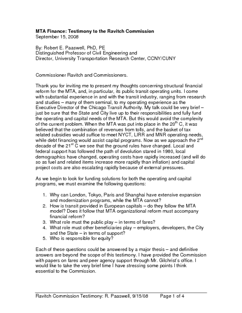 MTA Finance: Testimony by Dr. Paaswell to the Ravitch Commission