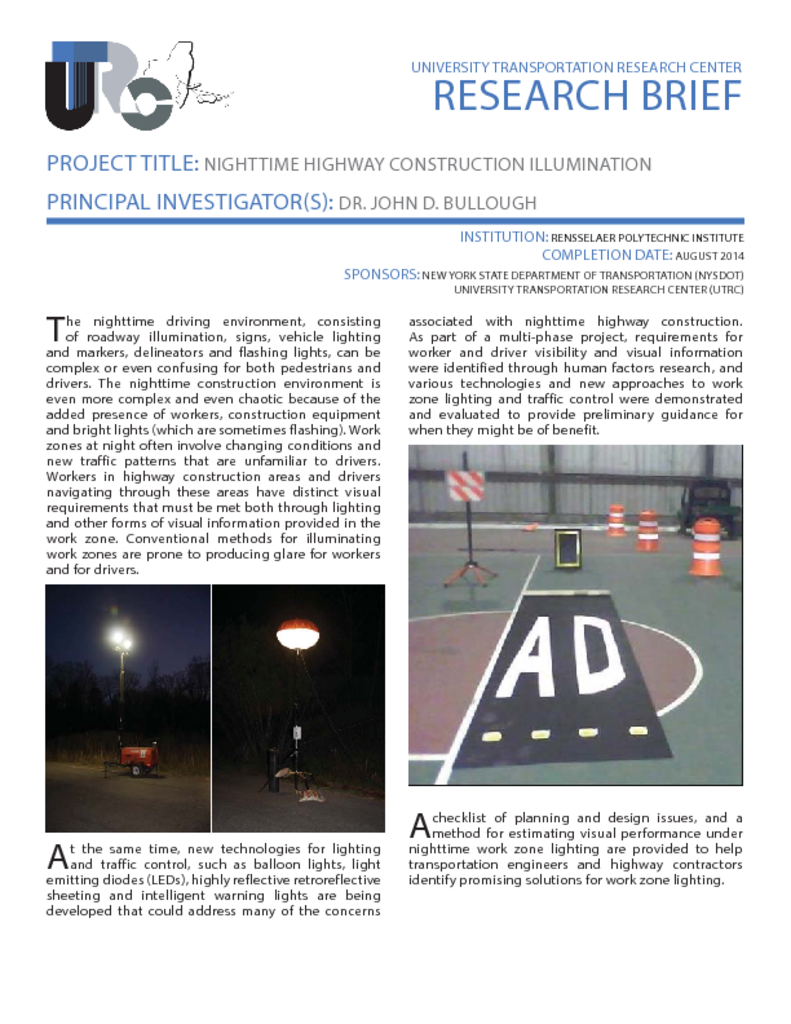 The nighttime driving environment, consisting of roadway illumination, signs, vehicle lighting and markers, delineators and flashing lights, can be complex or even confusing for both pedestrians and drivers. The nighttime construction environment is even more complex and even chaotic because of the added presence of workers, construction equipment and bright lights (which are sometimes flashing). Work zones at night often involve changing conditions and new traffic patterns that are unfamiliar to drivers. Workers in highway construction areas and drivers navigating through these areas have distinct visual requirements that must be met both through lighting and other forms of visual information provided in the work zone. Conventional methods for illuminating work zones are prone to producing glare for workers and for drivers. At the same time, new technologies for lighting and traffic control, such as balloon lights, light emitting diodes (LEDs), highly reflective retroreflective sheeting and intelligent warning lights are being developed that could address many of the concerns associated with nighttime highway construction. As part of a multi-phase project, requirements for worker and driver visibility and visual information were identified through human factors research, and various technologies and new approaches to work zone lighting and traffic control were demonstrated and evaluated to provide preliminary guidance for when they might be of benefit. A checklist of planning and design issues, and a method for estimating visual performance under nighttime work zone lighting are provided to help transportation engineers and highway contractors identify promising solutions for work zone lighting.