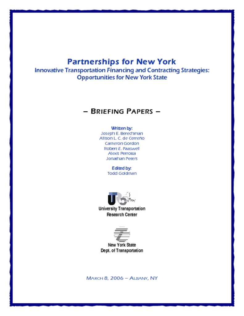 As we begin the 21st Century, New York State faces a pressing need to modernize and expand its transportation infrastructure in order to sustain its global economic leadership. The ever-growing need for personal mobility, the need to move increasingly greater amounts of freight, and the pressures of 21st Century economic competition all call for new and different types of capacity on our roads, our public transit systems, our rails, at our ports and the intermodal connections that link these together. Nothing is too daunting for New Yorkers; we have the capacity to grow, productively, into this exciting Century. But, and this is the but that drives this conference, these projects will require significant resources. The traditional ways of funding infrastructure projects – out of general revenues, or by the issuance of debt – are inadequate to meet these needs. The State that has provided the marvelous subway system of New York City, the magnificent George Washington Bridge, and the “pay for itself” New York Thruway must put its entrepreneurial skills to work as it builds a new generation of transportation and engineering marvels.