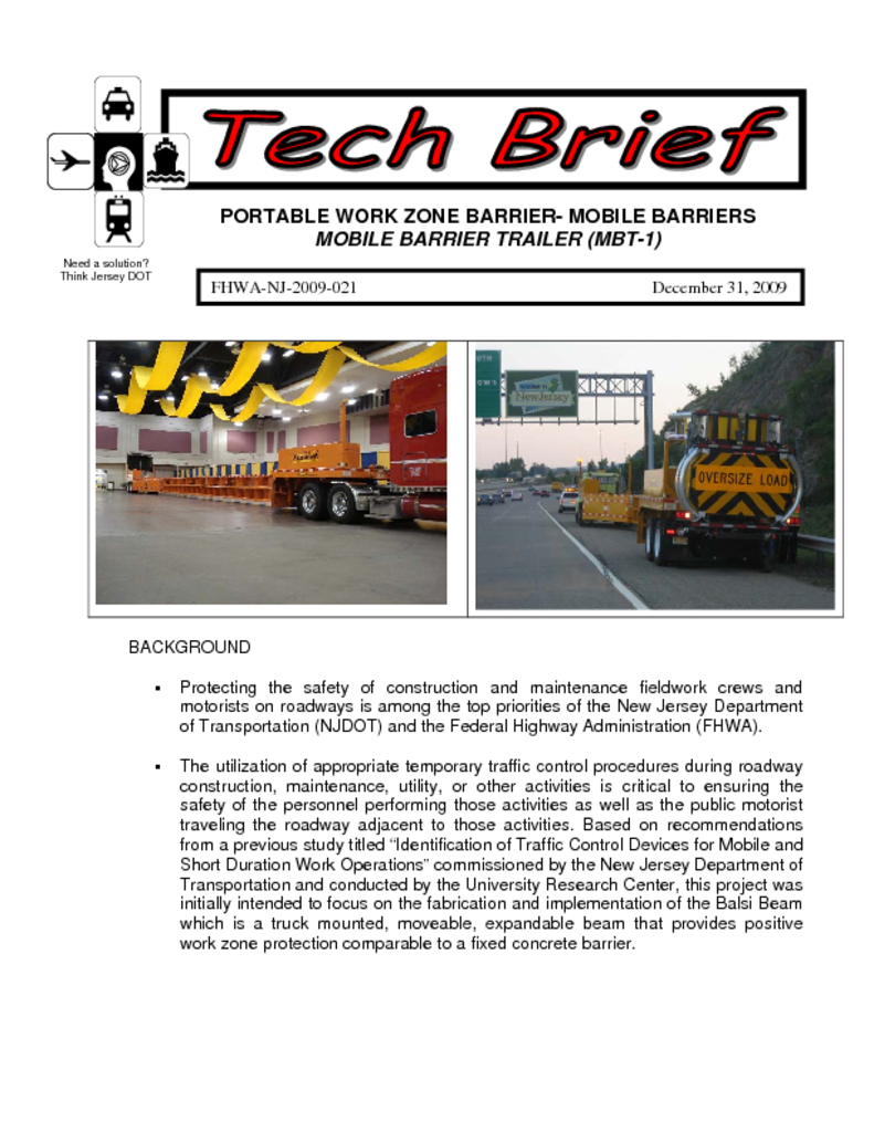 Protecting the safety of construction and maintenance field crews and motorists on roadways is the top priority of the New Jersey Department of Transportation (NJDOT) and the Federal Highway Administration (FHWA). More than 40,000 people are injured each year as a result of motor vehicle crashes in work zones. In addition, fatalities from work zone crashes have increased more than 50 percent in the last 5 years. The Mobile Barrier, a portable work zone protection device available, has been identified as having the potential to improve the safety of highway workers and motorists. The objective of this project is to increase safety at highway work zones for maintenance & construction field workers and motorists through implementation of a mobile work zone protection device that serves as an extendable physical barrier to protect the flank of a work zone. This project will oversee and advise NJDOT efforts to deploy a mobile barrier device in New Jersey.