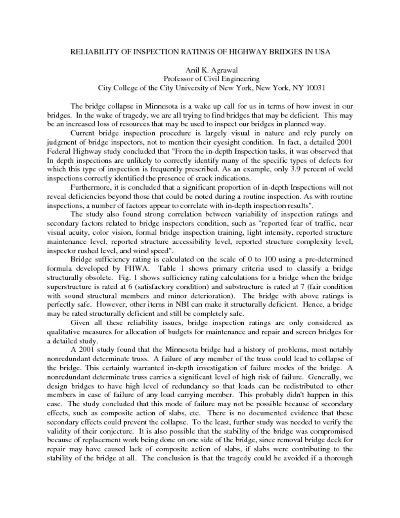 The bridge collapse in Minnesota is a wake up call for us in terms of how invest in our bridges. In the wake of tragedy, we are all trying to find bridges that may be deficient. This may be an increased loss of resources that may be used to inspect our bridges in planned way.