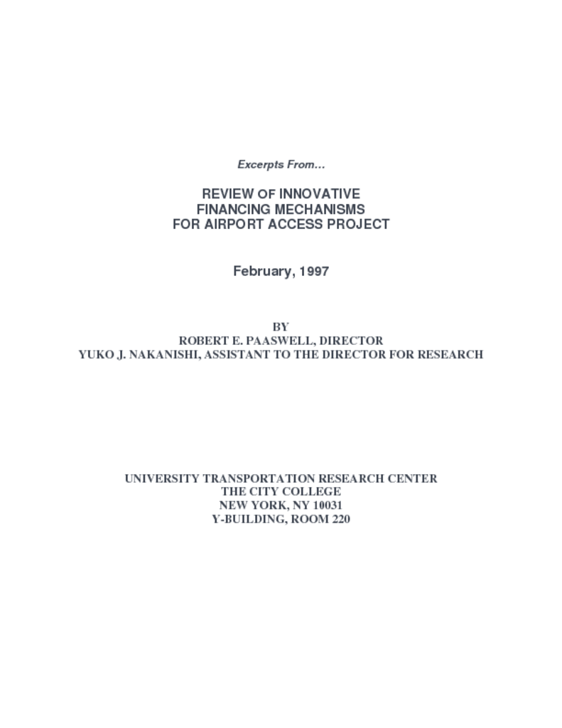 The airport access project addresses a longstanding problem affecting New York City travelers and residents, as well as out-of-town travelers. The project plans to link JFK International Airport to two transit terminals, Jamaica Station and Howard Beach Station. It is expected that over 34,000 passengers and employees will use the light rail system annually. The benefits of the project are expected to be increased airport accessibility, air quality, decreased traffic congestion, and enhanced economic activity and jobs during the construction phase as well as the operational phase of the project. The construction of the light rail system will cost approximately $1.2 billion; the current financing proposal would add another $0.28 billion. While Port Authority (PA) capital contribution is expected to be $0.3 billion, the Passenger Facility Charge (PFC) contribution is expected to shoulder the bulk of the financing burden - $1 .2 billion. The PFC which is $3 per enplaned passenger is collected by the airlines for the PA. According to Federal law, PFC money must be used for projects directly related to the airports. This means that 1) the light rail system can only serve airport-bound passengers and 2) the project would use a substantial amount of the PFC funds over a 13-year period; these funds would then be unavailable for other high priority airport-related projects. The purpose of the project is to review and identify alternative funding/financing mechanisms for the airport access project.