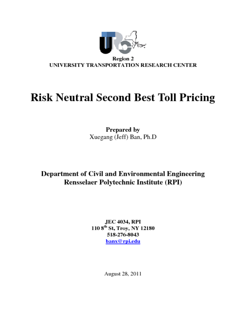 <p>As traffic congestion builds up rapidly in recent years especially in urban areas like the New York City, Congestion Pricing (CP) has been proposed and widely implemented, which has now become 'the single most viable and sustainable approach to reducing traffic congestion (1).' One form of CP is called Second-Best Toll Pricing (SBTP), i.e. imposing appropriate tolls on selected locations (such as bridges or tunnels) of a transportation network so that congestion can be reduced. Research on SBTP is rich and still growing. Many researchers have modeled SBTP as bi-level problems. The upper level is to optimize certain objective from the transportation system's point of view (such as the total network VMT) and the lower level is a user equilibrium (UE) problem (either deterministic or stochastic) to account for the choice behavior of individual motorists (2). Most existing SBTP models assume that under a certain toll motorists have a unique response. Such a uniqueness assumption requires strong assumption on travel time or cost function of the traffic, which may not hold especially in metro areas if strong interactions exist among different links. The non-uniqueness of motorists response to pricing represents uncertainty in the SBTP design, which was not well recognized before. The question is then how tolls should be designed to account for this uncertainty. In this project, we aim to develop a risk-neutral scheme for SBTP. Such a scheme is designed to be optimal for the 'average' scenario, i.e. the average objective value is minimized as the response varies within certain range. The proposed study will expand our previous work on risk-averse SBTP scheme, which determines the toll optimal for the 'worst case' scenario (3), as well as traditional SBTP design schemes which are risk-prone as they are optimal for the 'best case' scenario (4). By considering all possible responses of motorists under a given toll, the proposed risk-neutral scheme is expected to be more reliable for toll pricing. The proposed research includes four major tasks: literature review, development of a stochastic program for the risk-averse SBTP scheme, algorithm development for solving the risk-neutral model, and case studies. In particular, the risk-neutral model and its associated solution method will be tested on small-scale illustrative examples, as well as relatively large and real-world SBTP test examples. Results and findings will be summarized as a paper and submitted to a peer-reviewed journal for publication upon completion of the project. The proposed risk-neutral scheme, together with the risk-averse approach we developed recently, addresses the fundamental question of SBTP design when drivers responses to road pricing are diversified, changing, and not unique. By developing more reliable tolls that can accommodate changing (and sometimes uncertain) driver behaviors, it is expected that the proposed research will make significant contributions to the state-of-the-practice congestion pricing design in New York City and the entire State, which is now an increasingly critical issue for the region and the nation. As the research focuses on long-range static traffic pattern changes, it aims to facilitate traffic management agency?s to devise more effective toll pricing plans to better manage transportation systems in response to motorists? varied behaviors. Therefore, the proposed study directly addresses the mission of UTRC, especially on planning, management, and responses to change.</p>