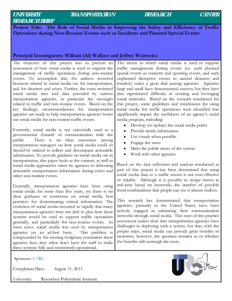 The objective of this project was to present an assessment of how social media is used to support the management of traffic operations during non-routine events. To accomplish this, the authors reviewed literature related to social media use for transportation, and for disasters and crises. Further, the team reviewed social media sites and data provided by various transportation agencies, in particular the messages related to traffic and non-routine events. Based on the key findings, recommendations for transportation agencies are made to help transportation agencies better use social media for non-routine traffic events.
