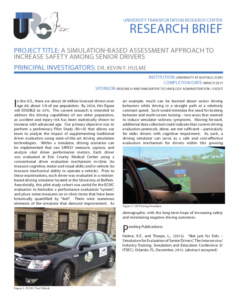 In the U.S., there are about 38 million licensed drivers over age 65; about 1/8 of our population. By 2024, this figure will DOUBLE to 25%. The current research is intended to address the driving capabilities of our older population, as accident and injury risk has been statistically shown to increase with advanced age. Our primary objective was to perform a preliminary Pilot Study (N=10) that allows our team to analyze the impact of supplementing traditional driver evaluation using state-of-the-art driving simulation technologies. Within a simulator, driving scenarios can be implemented that can SAFELY measure, capture, and analyze vital driver performance metrics. Each driver was evaluated at Erie County Medical Center using a conventional driver evaluation mechanism: in-clinic (to measure cognitive, motor and visual skills) and in-vehicle (to measure mechanical ability to operate a vehicle).