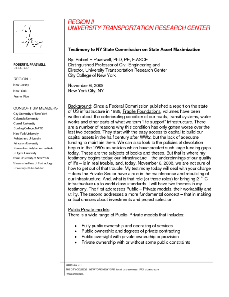 Testimony by Dr. Paaswell to NY State Commission on State Asset Maximization