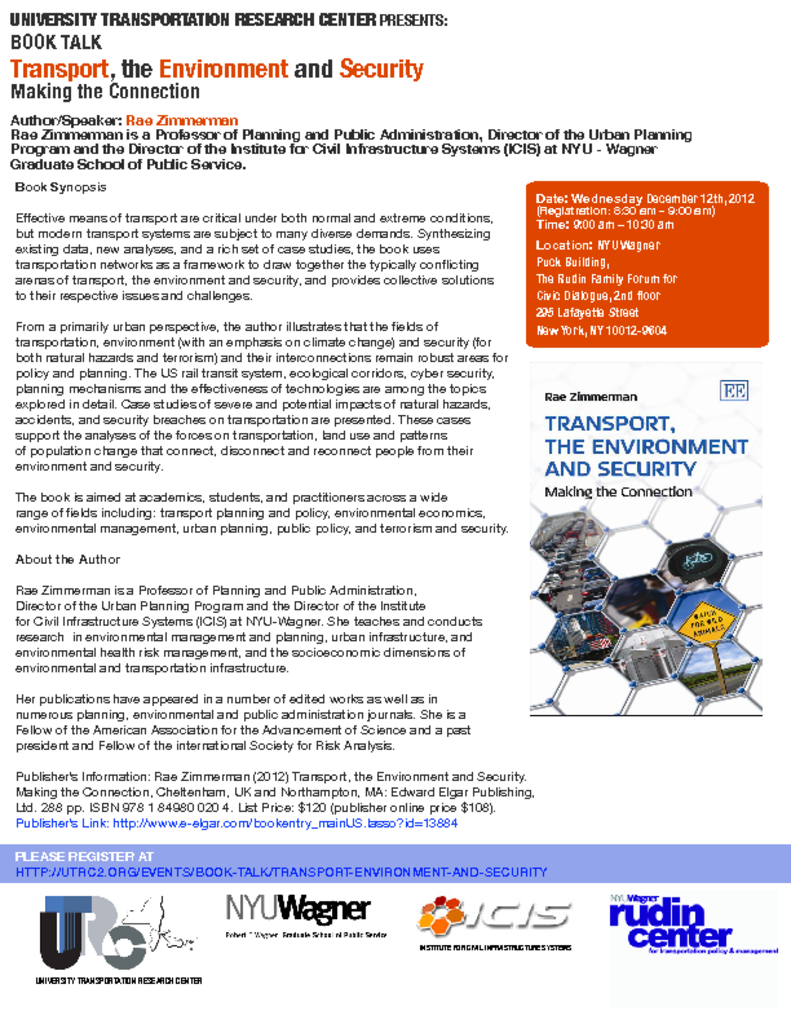 From a primarily urban perspective, the author illustrates that the fields of transportation, environment (with an emphasis on climate change) and security (for both natural hazards and terrorism) and their interconnections remain robust areas for policy and planning. The US rail transit system, ecological corridors, cyber security, planning mechanisms and the effectiveness of technologies are among the topics explored in detail. Case studies of severe and potential impacts of natural hazards, accidents, and security breaches on transportation are presented. These cases support the analyses of the forces on transportation, land use and patterns of population change that connect, disconnect and reconnect people from their environment and security. The book is aimed at academics, students, and practitioners across a wide range of fields including: transport planning and policy, environmental economics, environmental management, urban planning, public policy, and terrorism and security.