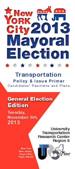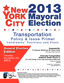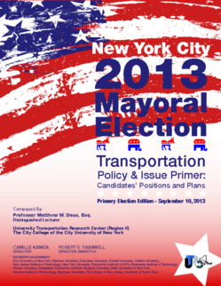 | Title: NYC Mayoral Transportation - White Paper Author(s): Publication Year: 2013 Primary day, Tuesday, September 10, 2013, is almost upon us, when voters around New York City (NYC) will take to the polls for the Republican and Democratic parties to select their nominees for Mayor. The University… |