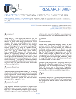 | Title: Effects of New Jersey's Cell Phone/Text Ban Author(s): Dr. Ali Maher Publication Year: 2013 The objectives of this research were to ascertain whether the legislation has had any effect on actual crash and citation data as well as understanding whether NJ drivers know about the ban and their attitudes toward… |