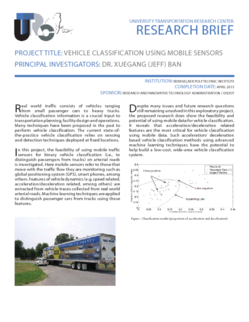| Title: Vehicle Classification Using Mobile Sensors Author(s): Dr. Xuegang (Jeff) Ban Publication Year: 2013 In this research, the feasibility of using mobile traffic sensors for binary vehicle classification on arterial roads is investigated. Features (e.g. speed related, acceleration/deceleration related, etc.) are… |