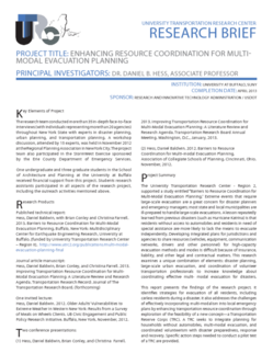 | Title: Enhancing Resource Coordination for Multi-Modal Evacuation Planning Author(s): Dr. Daniel B. Hess Publication Year: 2013 The University Transportation Research Center - Region 2, supported a study entitled “Barriers to Resource Coordination for Multi-Modal Evacuation Planning.” Extreme events that require large-scale evacuation are a… |