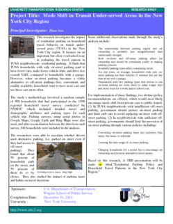 | Title: Mode Shift in Transit Under-served Areas in the New York City Region Author(s): Dr. Zhan Guo Publication Year: 2010 This research investigates the impact of residential parking on household travel behavior in transit under-served areas (TUSA) in the New York City region. It focuses on an important but often overlooked issue in reshaping the travel pattern in… |