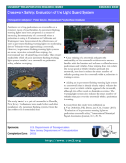 | Title: Crosswalk Safety: Evaluating the Lightguard System Author(s): Dr. Peter R. Boyce Publication Year: 2002 Accidents involving pedestrians on crosswalks are a common cause of road fatalities. In-pavement flashing warning lights have been proposed as a means of increasing the conspicuity of a crosswalk when a pedestrian is using it. Evaluations in… |