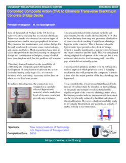 | Title: Controlled Composite Action Connectors: Proof of Concept Author(s): Dr. M. Ala Saadeghvaziri Publication Year: 2010 Tens of thousands of bridges in the US develop transverse deck cracking due to concrete shrinkage. Transverse cracks are observed on various types of superstructures and in most geographical locations. They increase the maintenance cost, reduce… |