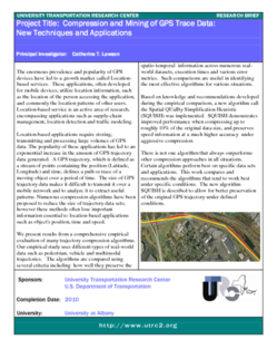 | Title: Compression and Mining of GPS Trace Data: New Techniques and Applications for Transportation Author(s): Dr. Catherine T. Lawson, Dr. Jeong-Hyon Hwang, Dr. Sekharipuram S. Ravi Publication Year: 2011 The massive volumes of trajectory data generated by inexpensive GPS devices have led to difficulties in processing, querying, transmitting and storing such data. To overcome these difficulties, a number of algorithms for compressing trajectory… |