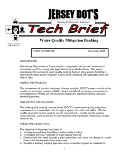| Title: Water Quality Mitigation Banking-Brief Author(s): Publication Year: 2009 New Jersey Department of Transportation is required to do “on-site” treatment of stormwater runoff to comply with applicable local and federal laws. This report investigates the concept of water quality banking that can allow greater flexibility… |