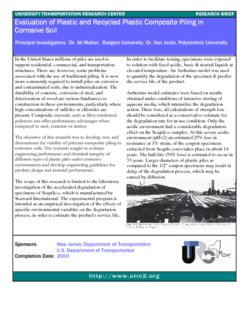 | Title: Evaluation of Plastic and Recycled Plastic Composite Piling in Corrosive Soil Author(s): Publication Year: 2000 In the United States millions of piles are used to support residential, commercial, and transportation structures. There are, however, some problems associated with the use of traditional piling. It is now more commonly required to install piles… |