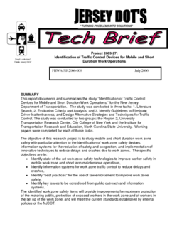 | Title: Identification of Traffic Control Devices for Mobile and ShortDuration Work Operations(Tech brief) Author(s): Publication Year: 2006 <p>This report documents and summarizes the study 'Identification of Traffic Control Devices for Mobile and Short Duration Work Operations,' for the New Jersey Department of Transportation. The study was conducted in three… |