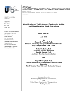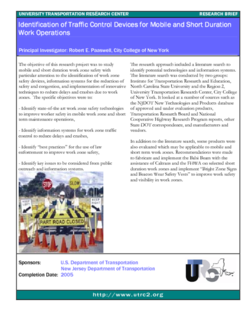 | Title: Identification of Traffic Control Devices for Mobile and ShortDuration Work Operations(Final Report) Author(s): Publication Year: 2006 <p>This report documents and summarizes the study 'Identification of Traffic Control Devices for Mobile and Short Duration Work Operations,' for the New Jersey Department of Transportation. The study was conducted in three… |