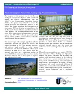 | Title: Intelligent Transportation Systems (ITS) DIRECTOR REGION 2 Operational Support Contracts Implementation Plan Author(s): Publication Year: 2005 <p>The New Jersey Department of Transportation (NJDOT) is currently facing a significant challenge in keeping Intelligent Transportation Systems (ITS) at a high level of availability at the Transportation Operation Center North (TOC North)… |