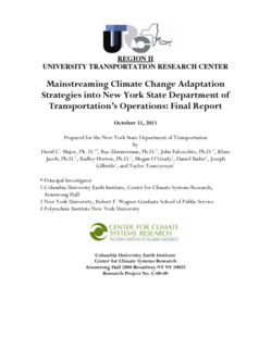 | Title: Mainstreaming Climate Change Adaptation Strategies into New York State Department of Transportation's Operations (Final Report) Author(s): Dr. David C. Major Publication Year: 2011 This study identifies climate change adaptation strategies and recommends ways of mainstreaming them into planned actions, including legislation, policies, programs and projects in all areas and at all levels within the New York State Department… |