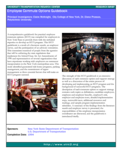 | Title: Employee Commute Options Guidebook Author(s): Publication Year: 1994 A comprehensive guidebook for practical employee commute options (ECO) was compiled for employers in New York State to provide them with the technical expertise to develop an ECO program. |