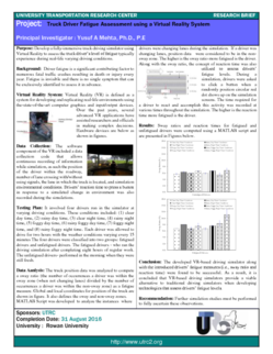 | Title: Truck Driver Fatigue Assessment using a Virtual Reality System Author(s): Dr. Yusuf A. Mehta Publication Year: 2016 Purpose: Develop a fully-immersive truck driving simulator using Virtual Reality to assess the truck driver’s level of fatigue typically experience during real-life varying driving conditions. Background: Driver fatigue is a significant… |